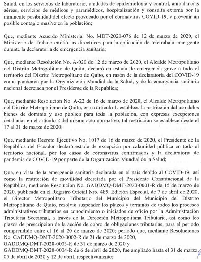 Resolución GADDMQ-DMT-2020-0005-R Amplíese la declaración de caso fortuito o fuerza mayor determinada en la resolución GADDMQ-DMT-2020-0001-R de 15marzo2020, publicada en la edición especial del RegistroOficial nº 485 de 7abril2020, y ratificada en